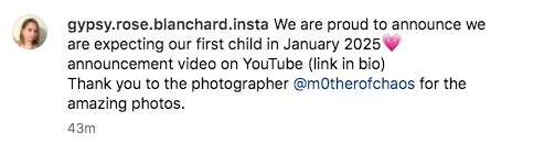 The 32-year-old announced today (July 9) that she’s pregnant with her first child. In an adorable picture collage featuring herself and boyfriend Ken Urker happily smiling, Gypsy Rose Blanchard showed off the ultrasound of their growing baby. She captioned the post,