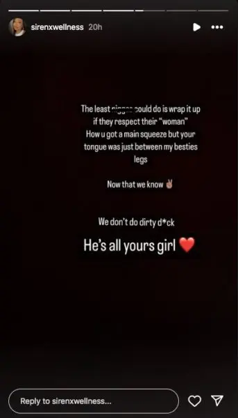 “The least n*gg*s could do is wrap it up if they respect their ‘woman.’ How u got a main squeeze but your tongue was just between my besties legs. Now that we know. We don’t do dirty d*ck. He’s all yours girl.”
