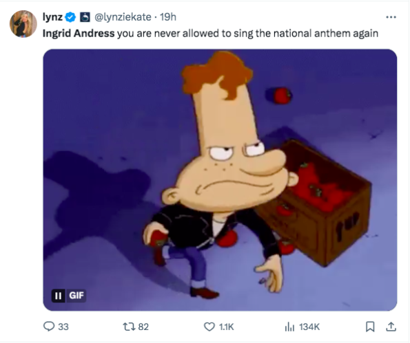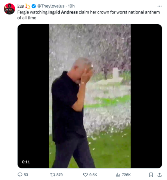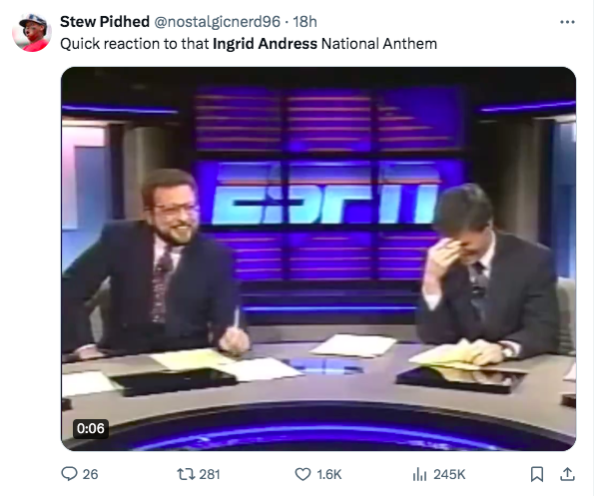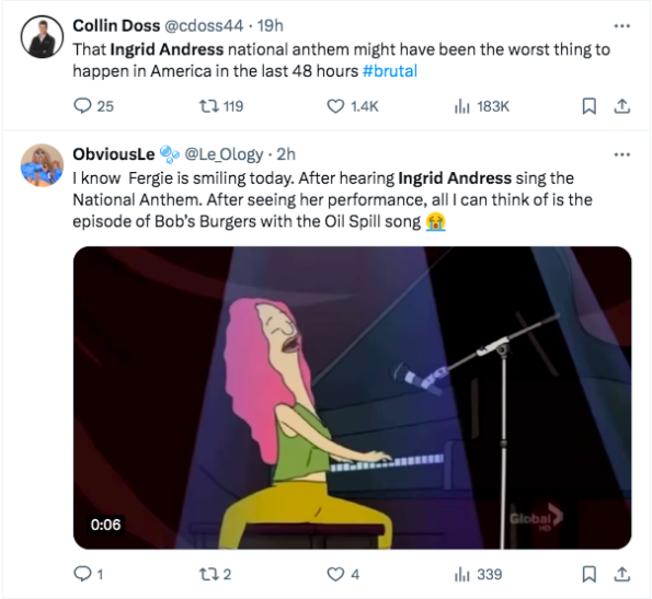 Video of her performance has gone viral online, with many comparing the moment to when Fergie sang the national anthem in 2018 at the NBA All-Star Game. The “London Bridge” artist became a meme, finding herself at the center of ongoing jokes from the public.