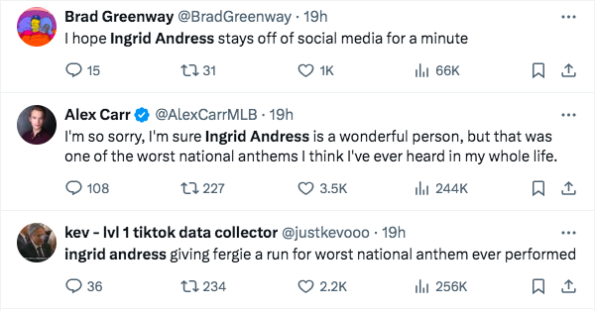 “I apologize to MLB, all the fans, and this country I love so much for that rendition. I’ll let y’all know how rehab is I hear it’s super fun. xo, Ingrid.”