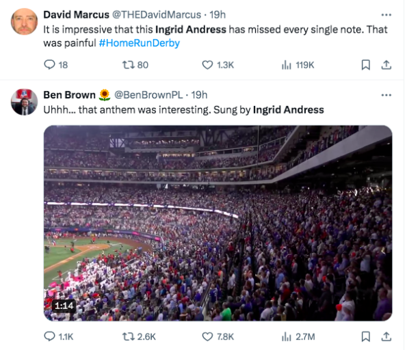 For Monday night’s (July 15) Home Run Derby at Texas’ Globe Life Field, country singer Ingrid Andress was tapped to perform the national anthem ahead of the start of the game. What was meant to be a beautiful moment of tradition was quickly turned into a viral moment of embarrassment as the crowd and home viewers realized something was off with Ingrid Andress, or at least her vocals.