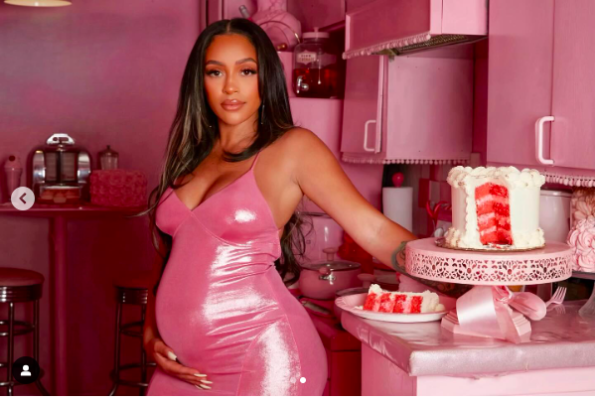 She posted a photo series on Instagram that included a white cake with the writing “Baby is a…” The next slide in the carousel revealed a pregnant Joie Chavis in a pink dress in an all-pink room, with the cake sliced open to reveal, of course, more pink.