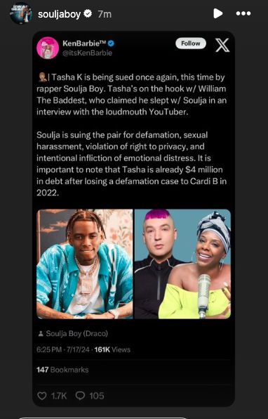 Soulja is reportedly suing for defamation, sexual harassment, violation of right to privacy, intentional infliction of emotional distress, and more. He’s seeking at least $16 million in damages. While it doesn’t appear that Tasha nor William have addressed the suit publicly, Soulja did repost a story covering the case to his Instagram story.