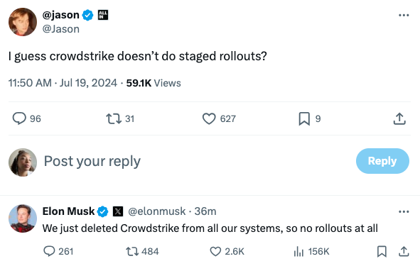 Despite concern over the ordeal, CrowdStrike has insisted that the situation is not the result of hacking or cyberattack. However, that hasn’t kept some industry professionals from denouncing use of their service. Billionaire entrepreneur and X (formerly Twitter) CEO Elon Musk announced the platform will no longer be using CrowdStrike. Responding to one user questioning the roll-out of their partnership, Elon Musk wrote: