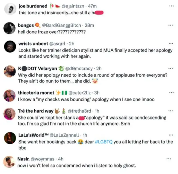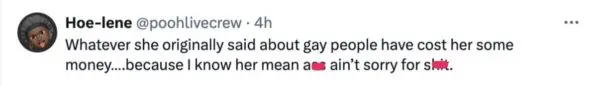 “Whatever she originally said about gay people cost her some money… because I know her mean a** ain’t sorry for s***.”