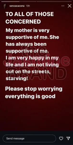 “TO ALL OF THOSE CONCERNED: My mother is very supportive of me. She has always been supportive of me. I am very happy in my life and I am not living out on the streets, starving! Please stop worrying, everything is good.”