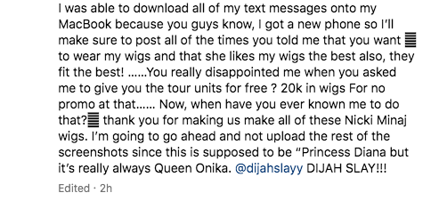 “You really disappointed me when you asked me to give you the tour units for free ? 20k in wigs For no promo at that…… Now, when have you ever known me to do that? thank you for making us make all of these Nicki Minaj wigs. I’m going to go ahead and not upload the rest of the screenshots since this is supposed to be “Princess Diana but it’s really always Queen Onika.”
