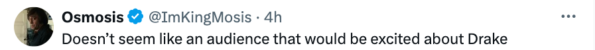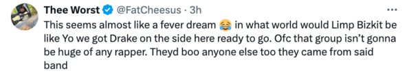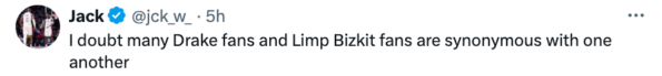 Others surmise, however, that there is just not much overlap between Drake and Limp Bizkit fans.