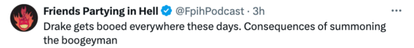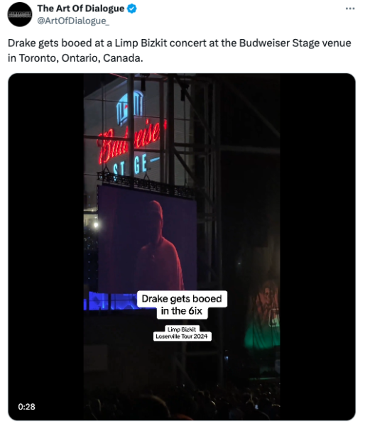 A video of Aubrey ‘Drake’ Graham, 37, getting boo’d at a concert for rock band Limp Bizkit, began circulating online earlier today (July 26th). The clip was reportedly taken at the band’s recent show at the Budweiser Stage venue in Toronto, Ontario, Canada, and featured audience members booing Drake after group member Fred Durst announced he was attending the show.