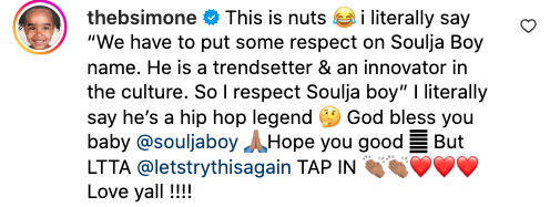 B. Simone went on to clarify that she has much respect for the rapper despite her opinion, hailing Soulja as a “hip-hop legend” and praising his contributions to the culture as an “innovator” and “trendsetter.” It doesn’t seem that Soulja cared too much for the sentiment.