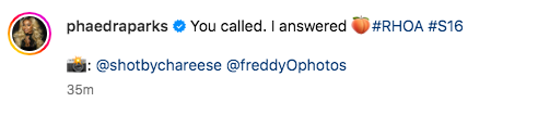 Moments ago (on July 29) Phaedra Parks confirmed that she’s returning to the popular Bravo reality series for season 16. In the Instagram post revealing the exciting news, Phaedra Parks poses in front of a plane with the signature peach for the Atlanta franchise in hand. She captioned the pictures,