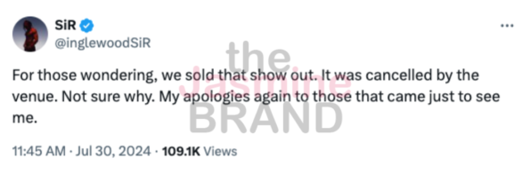 In follow-up messages, the “YOU” singer apologized for the abruptness of the situation and assured fans that his team was looking to reschedule. He also claimed that the venue pulled the plug on his concert, and alleged that he doesn’t know why they made the decision.