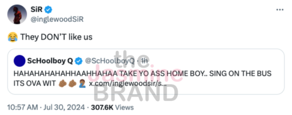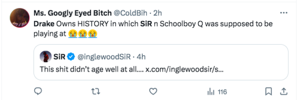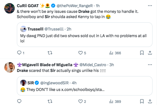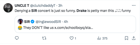 While Drake’s involvement has not been confirmed, SiR did share his suspicion in a subsequent post. Responding to ScHoolboy Q urging him to “take yo a** home”, SiR wrote: