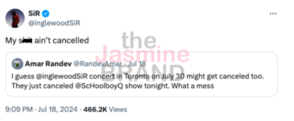 However, SiR, real name Sir Darryl Farris, 37, let his fans know he won’t take the stage at the venue as planned. Kicking off a series of X posts, SiR quote replied to a previous post, where he insisted that his performance in Drake’s hometown wouldn’t be canceled. The initial post came shortly after fellow TDE artist ScHoolboy Q’s show was pulled by Toronto police last week.
