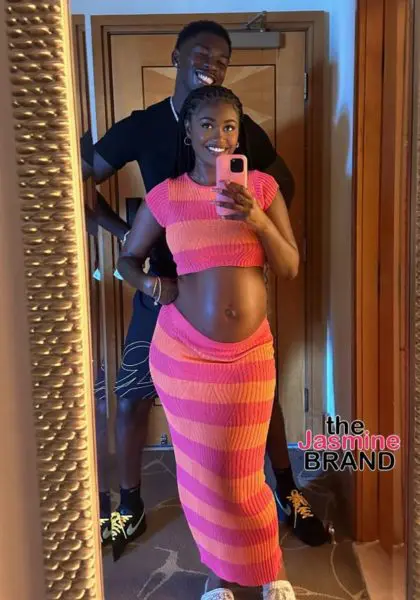 In the photo, Kaliii is seen wearing a pink two-piece, showcasing her growing baby bump, while NFL star Justyn Ross smiles in the background as they pose for a mirror selfie.
