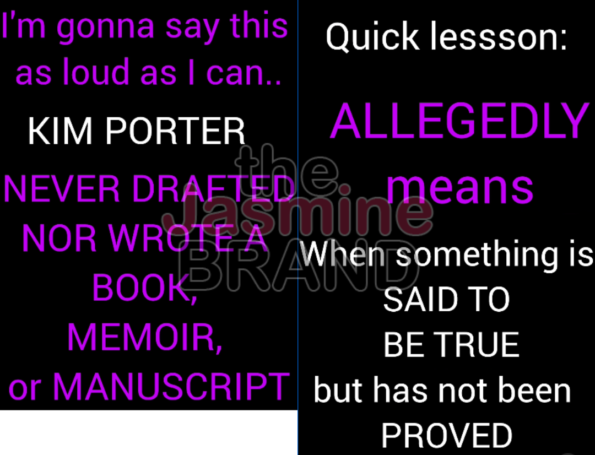 “I’m gonna say this as loud as I can.. KIM PORTER NEVER DRAFTED NOR WROTE A BOOK, MEMOIR, or MANUSCRIPT…Quick lesson: ALLEGEDLY means When something is SAID TO BE TRUE but has not been PROVED”
