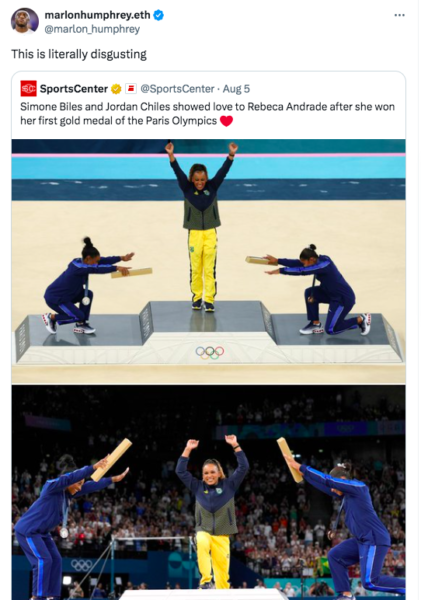 To celebrate such a special occasion, Simone Biles and Jordan Chiles bowed to Rebeca Andrade as she stepped on the podium to receive her medal. The picture taken of the three gymnasts quickly went viral, however, not everyone was pleased with Simone Biles and Jordan Chiles’ gesture.