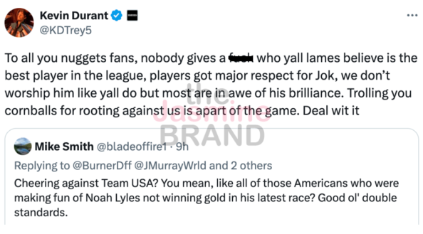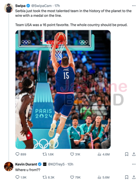 Kevin Durant, 35, addressed several individuals on X (formerly Twitter) around 5am this morning (Friday, August 9th), who had negative things to say about him and his Olympic teammates. In case you’re unfamiliar Team USA, comprised of LeBron James, Stephen Curry, Kevin Durant, and more, were nearly upset by underdogs Team Serbia, led by Serbia native and Denver Nuggets star Nikola Jokic, in the semifinals of the Olympic basketball tournament.