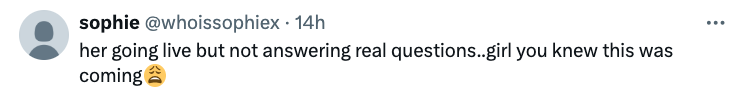 “her going live but not answering real questions..girl you knew this was coming”