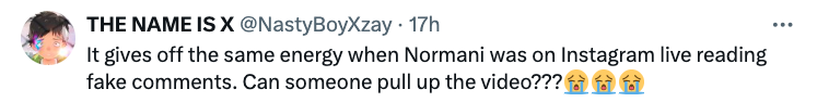 “It gives off the same energy when Normani was on Instagram live reading fake comments.”