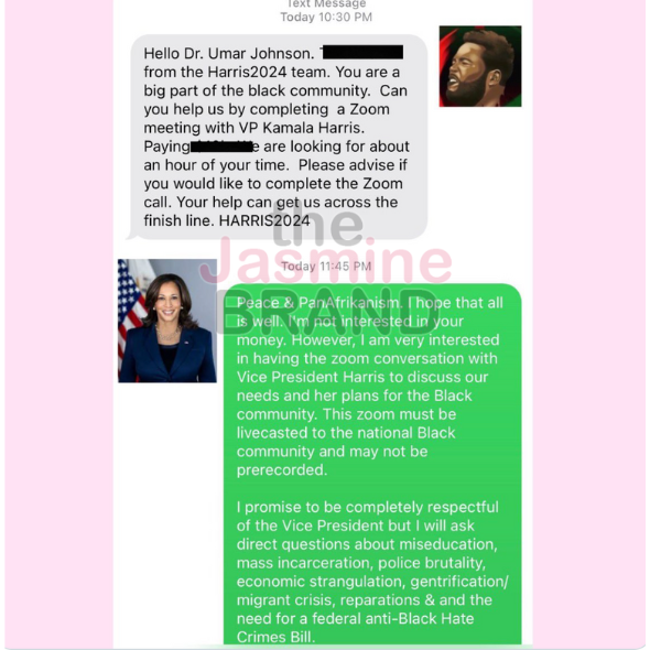 On Thursday (Aug. 15), Umar Johnson posted screenshots of text messages to his X (formerly Twitter) account that appeared to show someone from Kamala Harris‘ campaign reaching out to him. In the messages, the person alleged they were a member of Kamala Harris’ campaign and saluted Umar Johnson for being “a big part of the black community.”