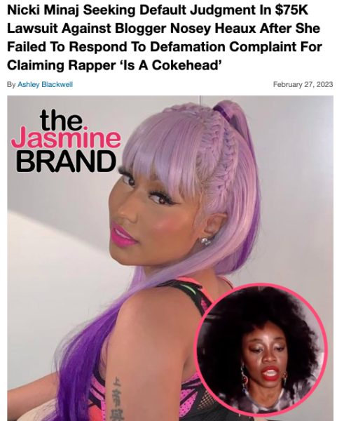 A judge ruled that gossip blogger Marley Green, also known by her social media monicker Nosey Heaux, had to make an apology for false statements she made about Nicki Minaj and barred her from ever mentioning the rapper in her content again. As you may recall the “Everybody” artist, real name Onika Tanya Maraj-Petty, sued the commentator back in 2022 after Marley Green accused her of using cocaine and made concerning comments about her then 1-year-old son.