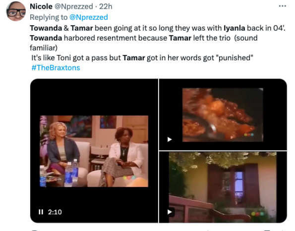 Tamar was visibly irritated throughout the entire exchange and rolled her eyes, grumbled, and accused Towanda of speaking to their other sisters everyday but not picking up when she calls unless they’re filming. Allegations which Towanda vehemently denied. Reacting to the feud, many social media users began discussing the course of Tamar and Towanda’s relationship over the years. One user shared a clip of the two going at back in 2004 during a session with celebrity inspirational speaker Iyanla Vanzant.