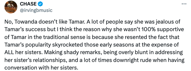 Many argued that they feel Towanda simple doesn’t like Tamar, and further surmised that she’s built up resentment towards her sister for leaving their girl group The Braxtons (made up of Trina, Towanda, and Tamar) back in the day. Some even claimed it seems as though Towanda is jealous of Tamar’s subsequent success as a solo artist and media personality.