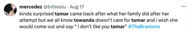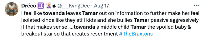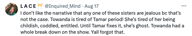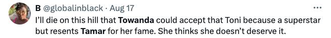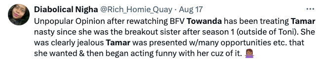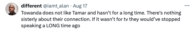 Others, however, slammed Tamar for her behavior. They argued that Towanda seems done condoning her sisters childish antics, and showed support to Towanda for not being afraid to cut off their relationship.