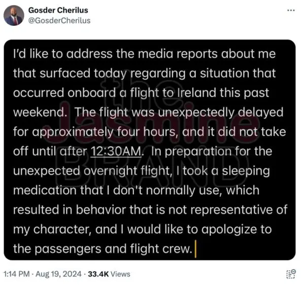 “I’d like to address the media reports about me that surfaced today regarding a situation that occurred onboard a flight to Ireland this past weekend.”