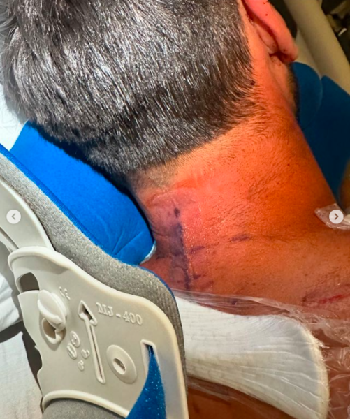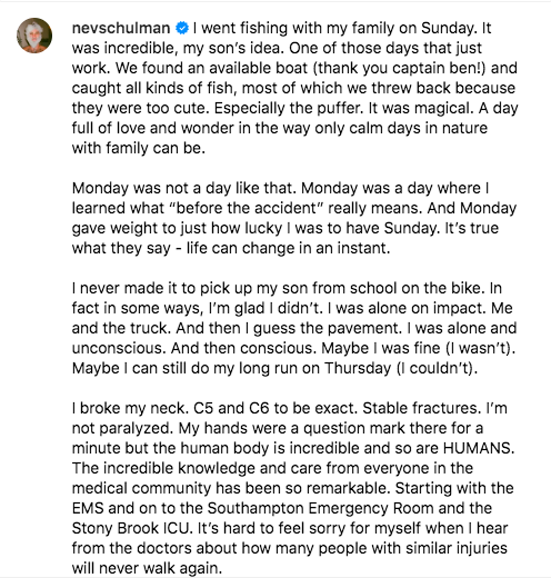 “I broke my neck. C5 and C6 to be exact. Stable fractures. I’m not paralyzed. My hands were a question mark there for a minute but the human body is incredible and so are HUMANS. …It’s hard to feel sorry for myself when I hear from the doctors about how many people with similar injuries will never walk again.”