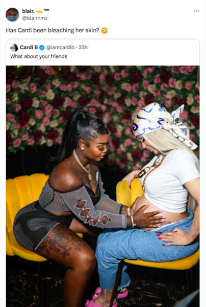 Yesterday (Aug. 20), Cardi B shared a picture online of her good friend Star Brim touching her growing baby bump. The heartfelt moment was, unfortunately, met with a few negative comments from naysayers. One internet troll even reposted the picture and asked if Cardi B had bleached her skin.