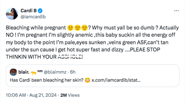 Earlier today (Aug. 21) Cardi B took a moment to address the allegation. Writing back to the X user, she said,