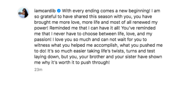 “With every ending comes a new beginning! I am so grateful to have shared this season with you, you have brought me more love, more life and most of all renewed my power! Reminded me that I can have it all! You’ve reminded me that I never have to choose between life, love, and my passion!”