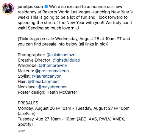 “We are thrilled to announce Janet’s upcoming residency. Janet is excited to connect with her fans and bring her iconic music to life in a fresh and dynamic way.”