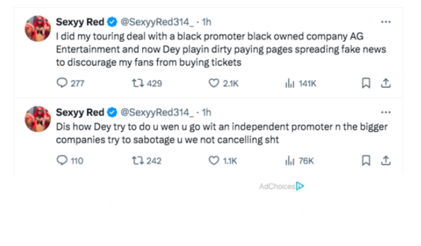 “I did my touring deal with a black promoter black owned company AG Entertainment and now Dey playin dirty paying pages spreading fake news to discourage my fans from buying tickets”