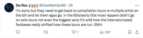 “I’m sorry but they need to get back to compilation tours w multiple artist [SIC] on the bill and let them egos go. In the 90s/early 00s most rappers didn’t go on solo tours not even the biggest acts it’s wild how the internet/crazed fanbases really shifted how these tours are run. SMH”