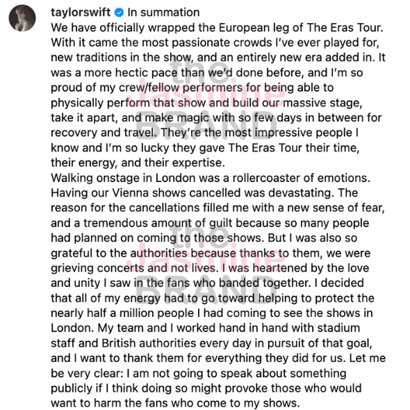 On Wednesday (Aug. 21), she posted a handful of photos of her onstage for her international The Eras tour and wrote a lengthy caption of the emotion she experienced by having to cancel the Vienna shows scheduled for Aug. 8 – Aug. 10.