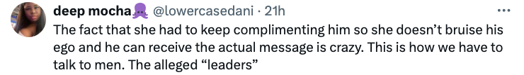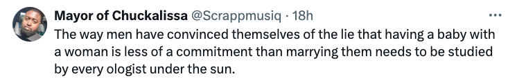 “You are proactively choosing where you want to be active at…you want to take your time in having a wife because of your own fears, but you will – and I say this with all respect and love…you will selfishly create broken families even if you’re in their life and a proactive father…these families are still broken. Every child can not have papa in the house with them…So some child, if not all – all – will end up with some kind of deficit.”