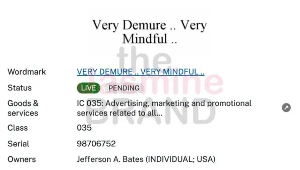 Jefferson Bates, a Washington State resident, filed the trademark for “Very Demure, Very Mindful” for services related to advertising and promotional activities.