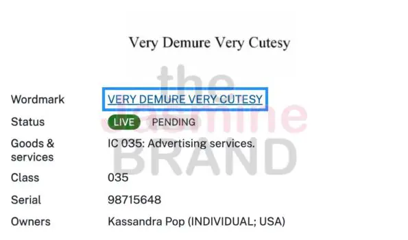 Additionally, Kassandra Pop has filed for “Very Demure, Very Cutesy” for advertising services.