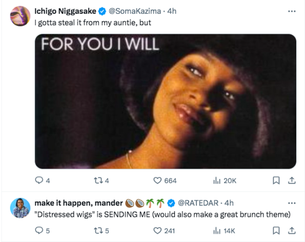 “Can you guys please send me pictures of yall going to the theater in your distressed wigs?