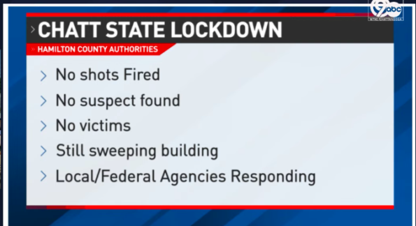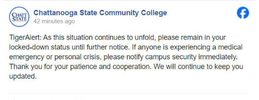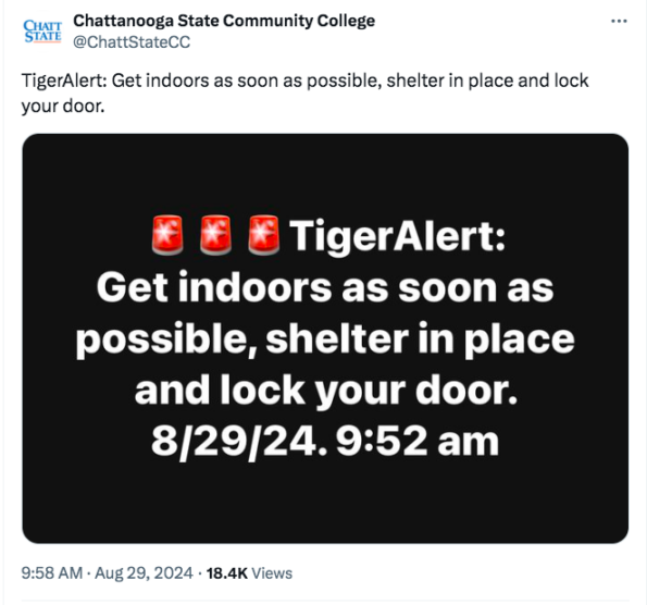 According to reports, Chattanooga State Community College students and staff started off their Thursday morning (Aug. 29) with an alert warning them to “Get indoors as soon as possible, shelter in place and lock your door.”