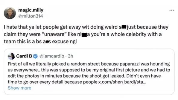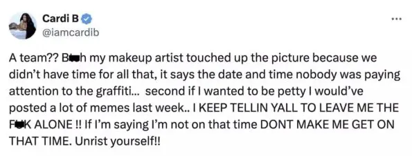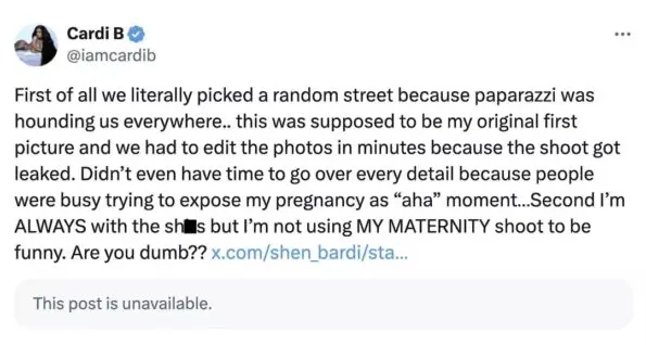 Amid fans suggesting the graffiti in the background was a subtle diss towards the “Super Freaky Girl” rapper, Cardi took to X (formally Twitter) to clarify how the maternity photos turned out. Some also called out the Grammy-winning rapper for having the controversial term displayed in the first place. She wrote,
