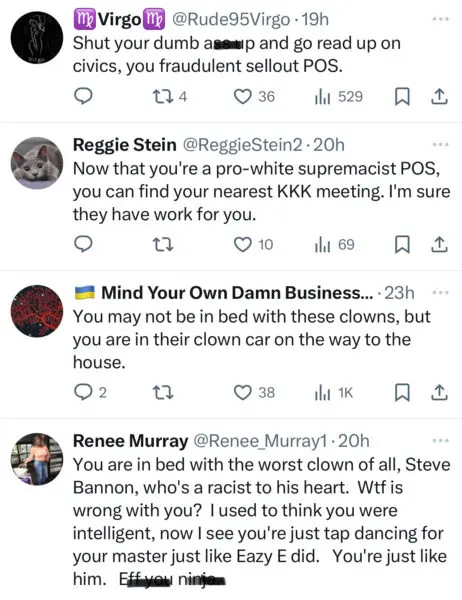 “@icecube I truly will never listen to any idiot like yourself who is in bed with steve bannon. you want to vote for trump? go right ahead *sswhole.”