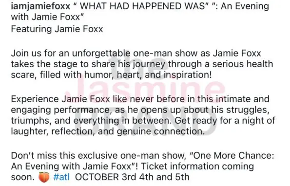 Don’t miss this exclusive one-man show, ‘One More Chance: An Evening with Jamie Foxx’! Ticket information coming soon. ? #ATL OCTOBER 3rd 4th and 5th.”