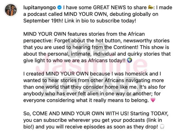 In her announcement, Nyong’o explained her motivation behind creating the podcast and elaborated on its intended audience. She shared that Mind Your Own is for anyone who has ever felt out of place or struggled with a sense of belonging: