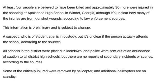 According to a recently updated report from CNN, at least 4 people have died in the school shooting that occurred at Apalachee High School, and 30 others were injured. It’s currently unclear how many of those injuries are gunshot wounds, according to law enforcement sources. It also has not been released to the public at the moment if the suspect, who is in custody, is a student of the high school.