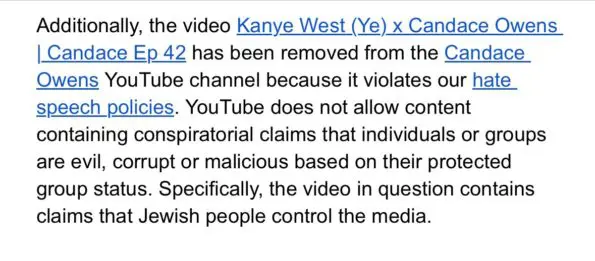 YouTube’s notification stated the reason for removing the video, explaining that it contained claims violating their hate speech policies, specifically mentioning Kanye’s statement that “Jewish people control the media.”