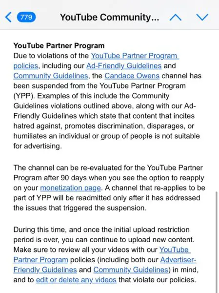 A screenshot of the email from YouTube confirmed that Owens’ channel was removed from the YouTube Partner Program (YPP) due to violations of their Ad-Friendly and Community Guidelines. The email explained that her content was deemed unsuitable for monetization and that she could reapply after 90 days.